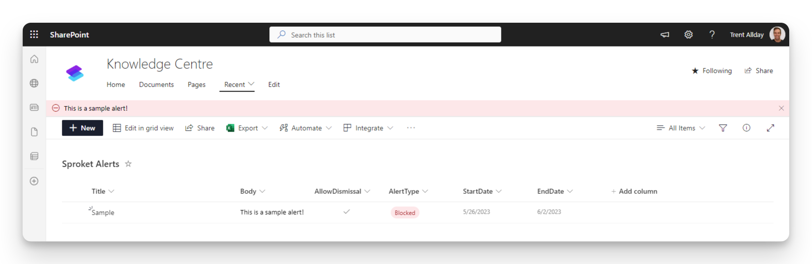 Manage Alertsbutton to load the SharePoint list containing alerts -