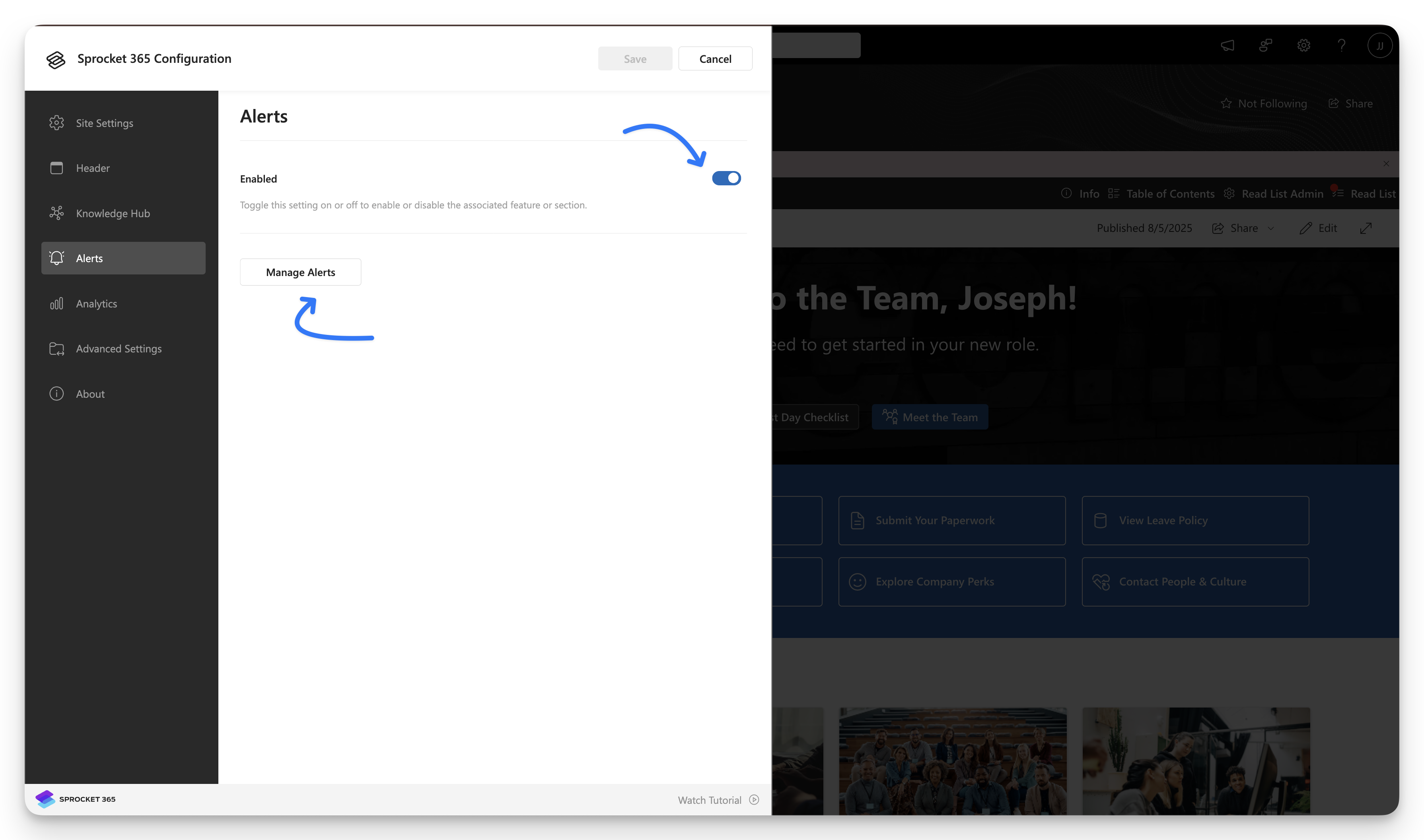 Ensure Alerts are enabled in the Sprocket configuration panel and click save.