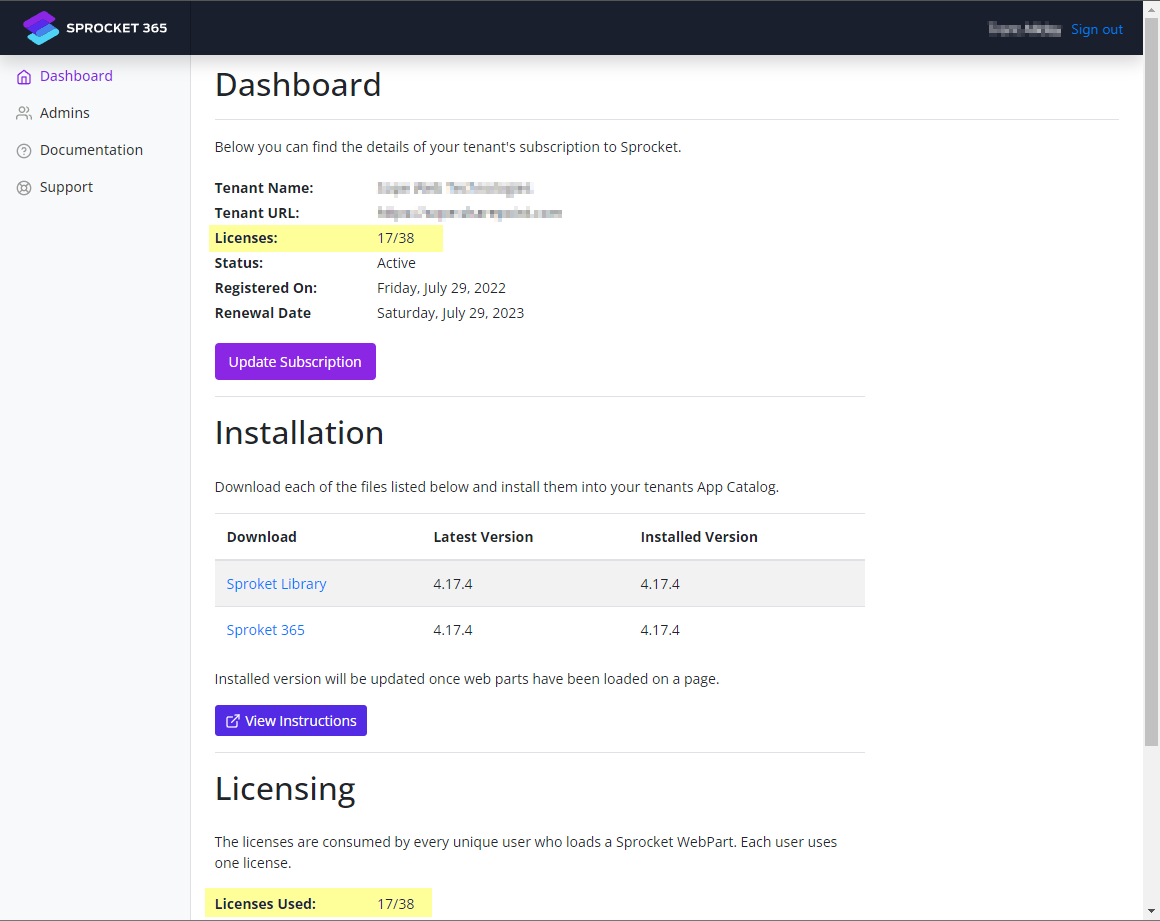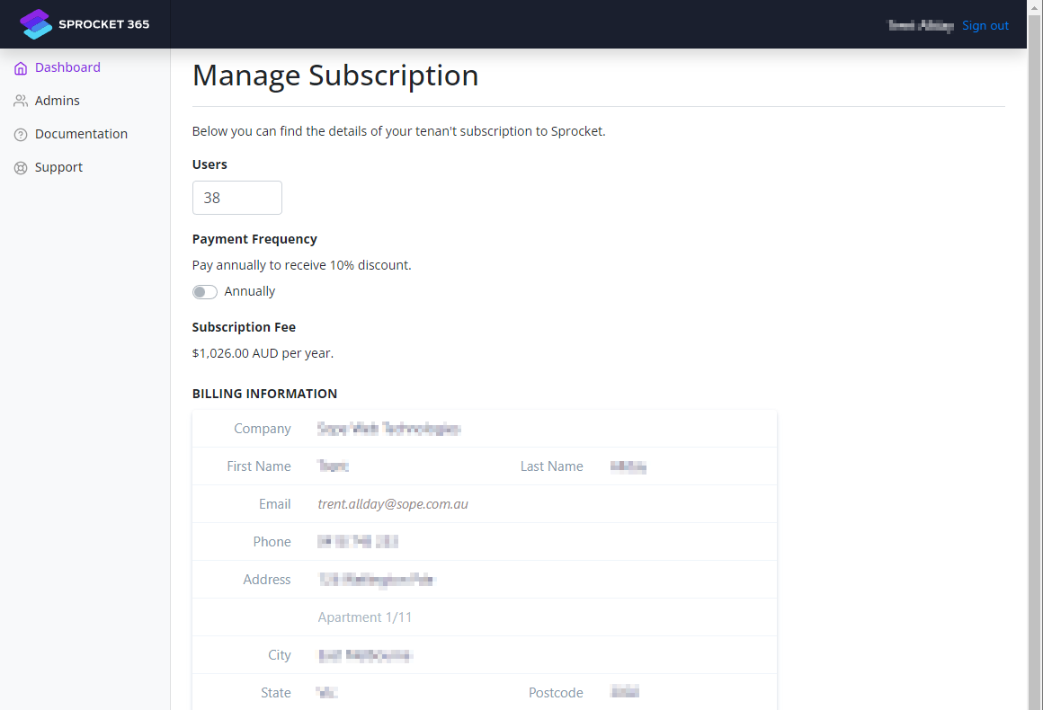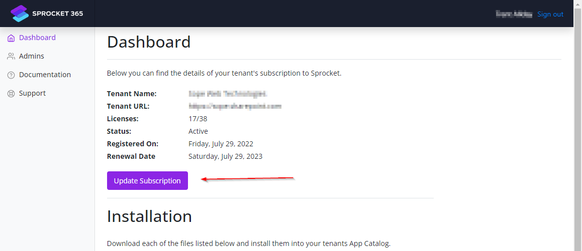 This screen shows you the details of your tenant’s subscription to Sprocket.