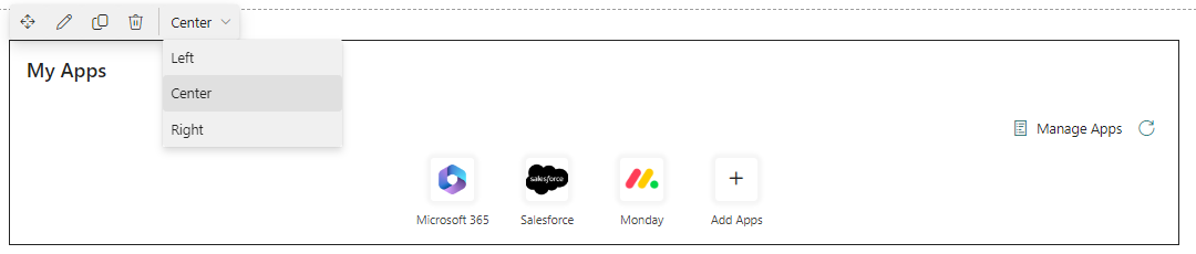 - In Edit mode, you can also align the Apps to the left, center or right. Select your alignment in the configurations tool bar and click